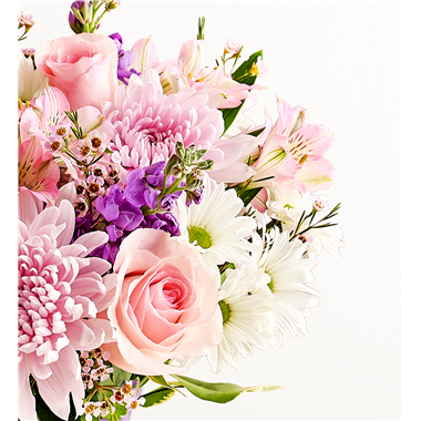 You know she’s amazing; now show her that you know. Roses, Peruvian lilies, daisy poms, and other lush blooms arrive artfully arranged in a lavender glass vase, resulting in a gift as beautifully splendid as she is. You also have the option to add a heart-shape LED pick with the sentiment “Amazing Mom.”